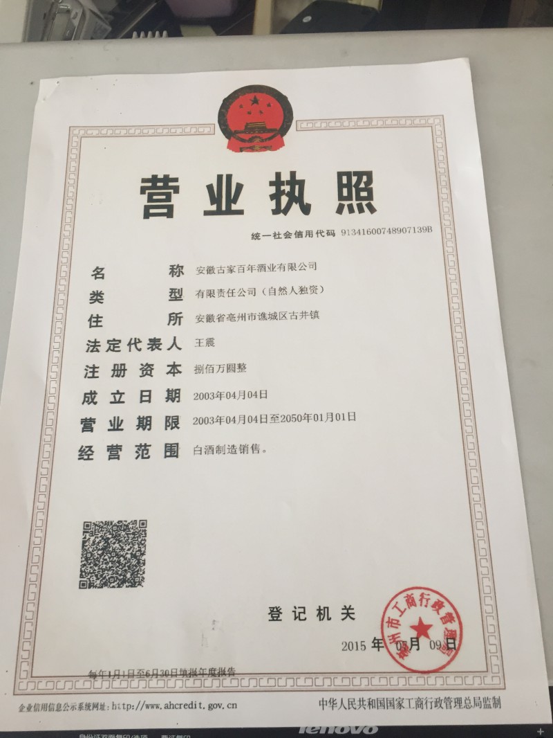 營業(yè)執(zhí)照,安徽古家百年酒業(yè)有限公司