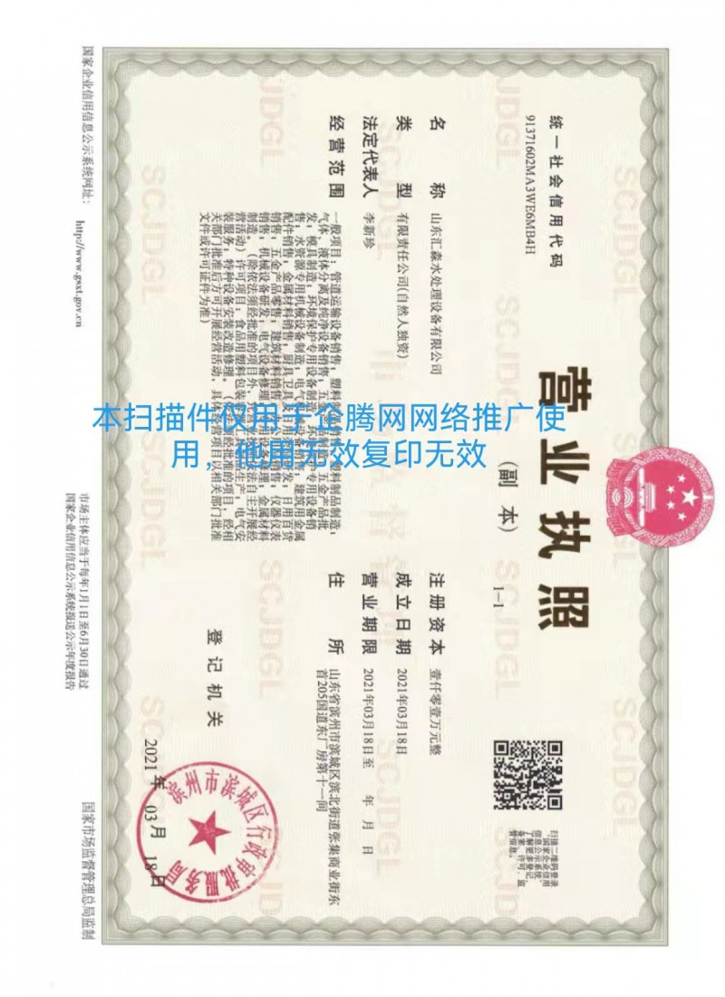 營業執照,山東匯淼水處理設備有限公司