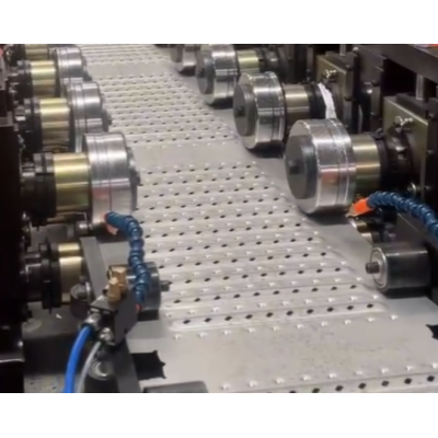 主要由:自動放料機(jī)—校平—送料部分—連續(xù)沖孔部分—成型部分—定尺切斷部分—自動折彎—收料臺、電氣控制柜等部件組成 。