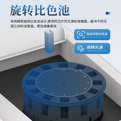 4、檢測(cè)通道:≥12通道;采用精密旋轉(zhuǎn)比色池設(shè)計(jì),使用同芯片同光源校準(zhǔn)精度,解決不同光源之間的誤差值,更加準(zhǔn)確高效。