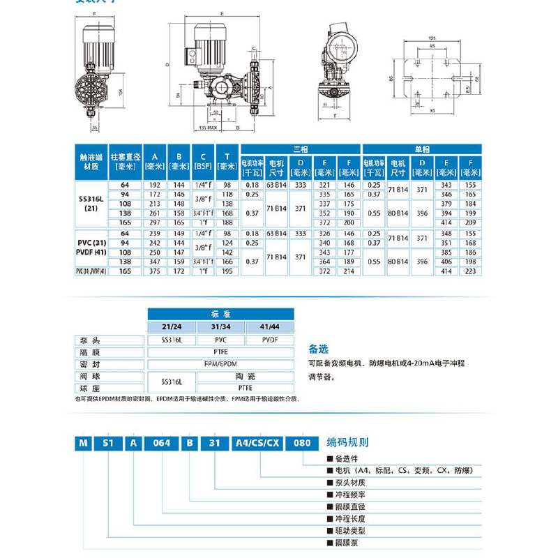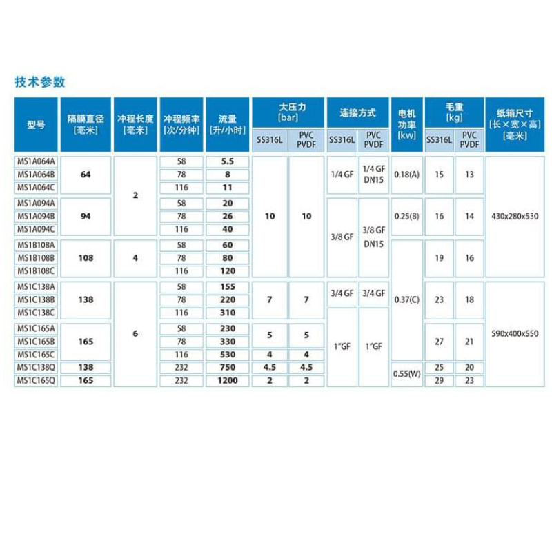 流量: 5.5-1200升/小時 大壓力:10bar 沖程頻率:58/78/116/232次/秒分鐘 隔膜直徑:65-165毫米 電機:標準功率0.18/0.25/0.37/0.55KW(IP55) 沖程長度: 2/4/6毫米