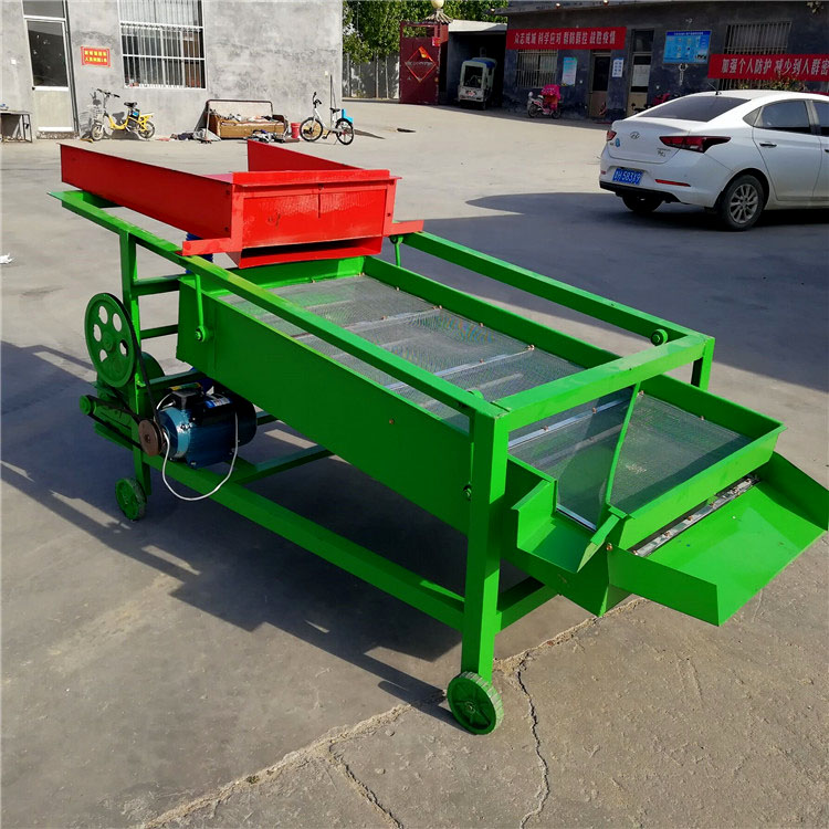 該精選篩為二層篩網,先經過進料口處風機抽風,直接抽走重量輕的雜葉或麥秸稈,上層篩的初次篩分再把大雜清理過,好的糧食(種子)直接落到下層篩網上,下層篩網會把糧食(種子)中的小雜.小石子.有缺陷的糧食(種子)直接漏掉,完好的糧食(種子)會從出料口篩分出來。該小型清糧機解決了揚場機的功能單一,不能有效去除石子.土塊的缺陷,更能為清理.凈選糧食(種子)帶來滿意的效果。該機有占地小,移動方便,便以維修,除塵除雜效率明顯,能耗低,使用簡便等優點。