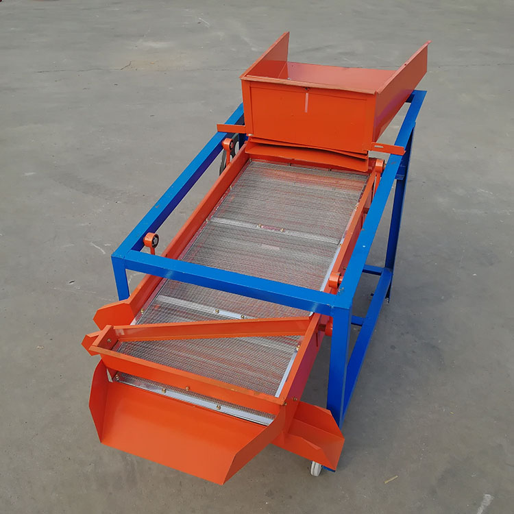 該精選篩為二層篩網,先經過進料口處風機抽風,直接抽走重量輕的雜葉或麥秸稈,上層篩的初次篩分再把大雜清理過,好的糧食(種子)直接落到下層篩網上,下層篩網會把糧食(種子)中的小雜.小石子.有缺陷的糧食(種子)直接漏掉,完好的糧食(種子)會從出料口篩分出來。該小型清糧機解決了揚場機的功能單一,不能有效去除石子.土塊的缺陷,更能為清理.凈選糧食(種子)帶來滿意的效果。該機有占地小,移動方便,便以維修,除塵除雜效率明顯,能耗低,使用簡便等優點。