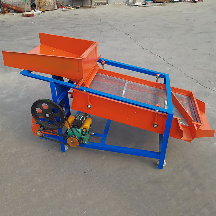 該精選篩為二層篩網,先經過進料口處風機抽風,直接抽走重量輕的雜葉或麥秸稈,上層篩的初次篩分再把大雜清理過,好的糧食(種子)直接落到下層篩網上,下層篩網會把糧食(種子)中的小雜.小石子.有缺陷的糧食(種子)直接漏掉,完好的糧食(種子)會從出料口篩分出來。該小型清糧機解決了揚場機的功能單一,不能有效去除石子.土塊的缺陷,更能為清理.凈選糧食(種子)帶來滿意的效果。該機有占地小,移動方便,便以維修,除塵除雜效率明顯,能耗低,使用簡便等優點。