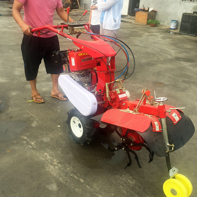 本機器包括機架、可調高低扶手,機架上設有(風冷或水冷)柴油機或汽油機、機架和扶手上設置有變速箱,變速箱的輸出軸上設置有能夠沿軸移動的驅動輪或鏈軌.傳動方式主要有:全齒輪傳動、皮帶傳動、鏈條傳動三種傳動方式.該機具有重量輕,油耗低、相對功率大,結構緊湊、機動性強、操縱輕便靈活的特點。可爬坡、越埂、階梯性強。廣泛適用于平原、山區、丘陵的旱地、水田、果園、菜地、煙地的深旋耕、淺旋耕、犁耕。配上相應機具可進行旱地旋耕、水田旋耕、抽水、開溝、噴淋、噴藥除草碎土等作業,還可牽引拖車進行短途運輸,是大中型農機無法媲美的多功能田園管理機,工作穩定可靠、使用壽命長、維修方便等特點。是進入農民家庭最理想的田園管理機。