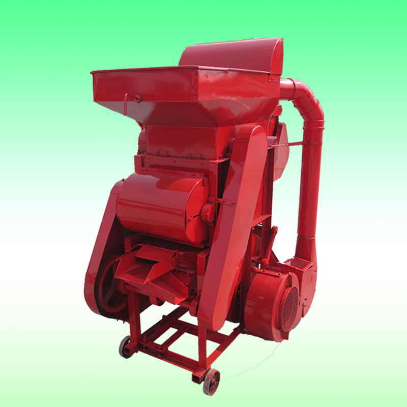 花生脫殼機有機架、風扇、轉子、單相電機、篩網(有大小兩種)、入料斗、震動篩、三角帶輪及其傳動三角帶等組成。機具正常運轉后,將花生定量、均勻、連續地投入進料斗,花生在轉子的反復打擊、摩擦、碰撞作用下,花生殼破碎。花生粒及破碎的花生殼在轉子的旋轉風壓及打擊下,通過一定孔徑的篩網(花生次脫粒用大孔篩網,清選后的小皮果更換成小孔篩網進行第二次脫殼),這時,花生殼、粒受到旋轉風扇的吹力作用,重量輕的花生殼被吹出機體外,花生粒通過震動篩的篩選達到清選的目的。