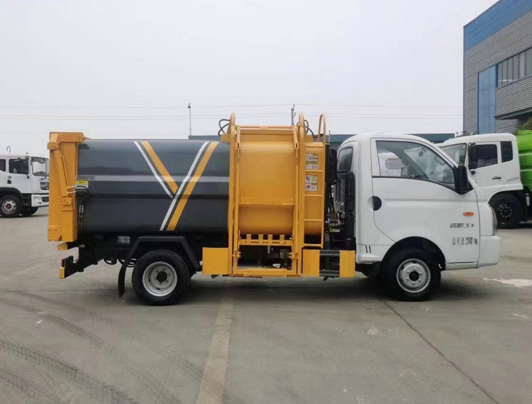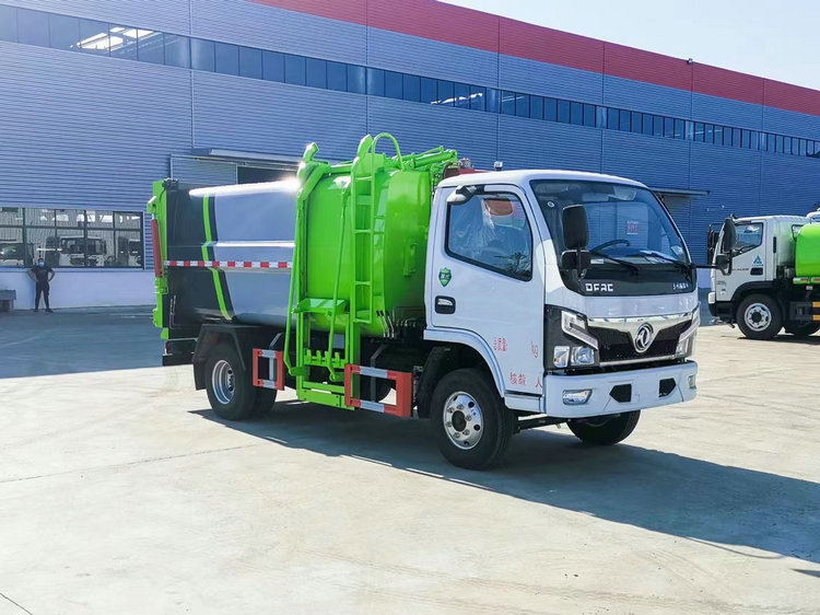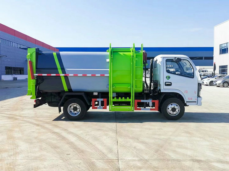 上裝配置:箱體材質為Q235碳鋼板焊接而成,容積6方,箱體底部油缸舉升自卸,側面提升機可選拉桿式、鏈條式,掛240L標準塑料垃圾桶,后門手動開啟。選裝配置手電一體,箱體加厚電議。