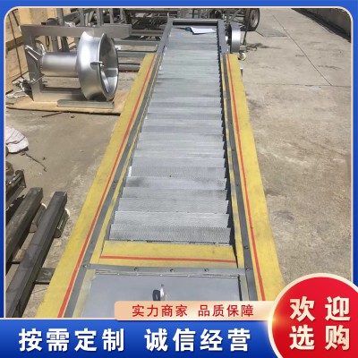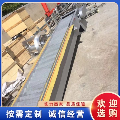 (2)機架;整個格柵部件直接安裝在渠道上,水中的固體物由網板串接成的濾帶捕獲,送至除污機驅動裝置后部的較高位置后排出。同時一個旋轉的刷子還對網板進一步清潔。網板式階梯格柵除污機的機架為采用不銹鋼板與型鋼焊接成一整體式剛性結構,焊接后的清污機機架為一剛性整體,并具有足夠的強度和剛度,在規定水位差的工況下不發生扭曲變形現象,機架材料全部采用不銹鋼,二側板間隔一定距離設置橫撐,保證設備安全可靠運行。焊接后的格柵機架為一剛性整體,具有足夠的強度和剛度,在1.0米水位差的工況下不發生扭曲變形現象。機架的兩側與格柵井之間留有間隙,通過機架的兩側橡膠封板來防止漂浮垃圾通過。機架二側設置安裝連接支座,與基礎平臺之間用膨脹螺栓安裝固定。