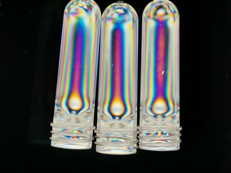 2.當瓶坯置于應力儀中45度角時可以觀測到瓶坯邊緣處彩色的雙折射條紋,