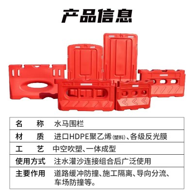 1、水馬中空灌水,具有緩沖彈性,能有效吸收強大撞擊力,降低交通事故;組合使用,整體承受力更強,更加穩固