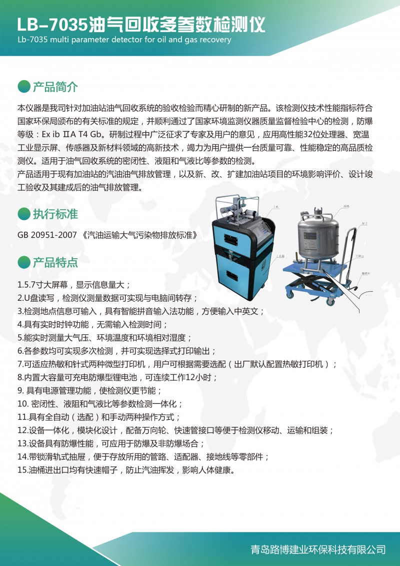 LB-7035 型油氣回收多參數檢測儀是我司針對加油站油氣回收系統的驗收 檢驗而精心研制的新產品。該檢測儀技術性能指標符合生態環境部、guojia市場監 督管理總局頒布的《GB20952-2020 加油站大氣污染物排放標準》 規定,并順利 通過了guojia環境監測儀器質量監督檢驗中心的檢測, 防爆等級: Ex ib ⅡA T4 Gb。